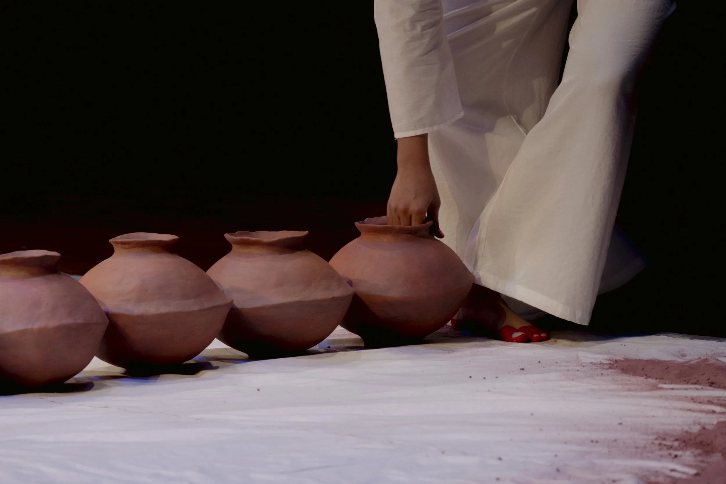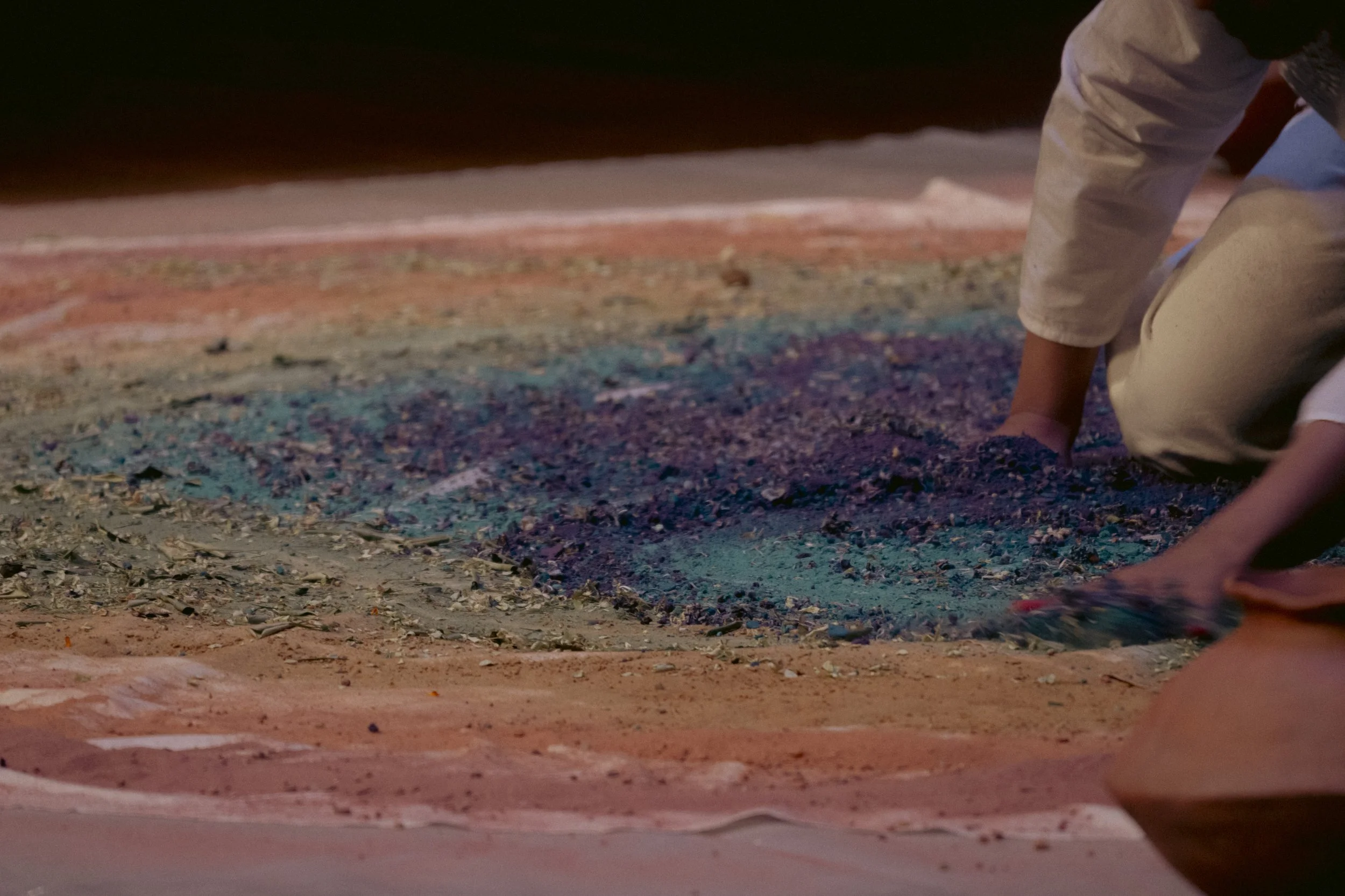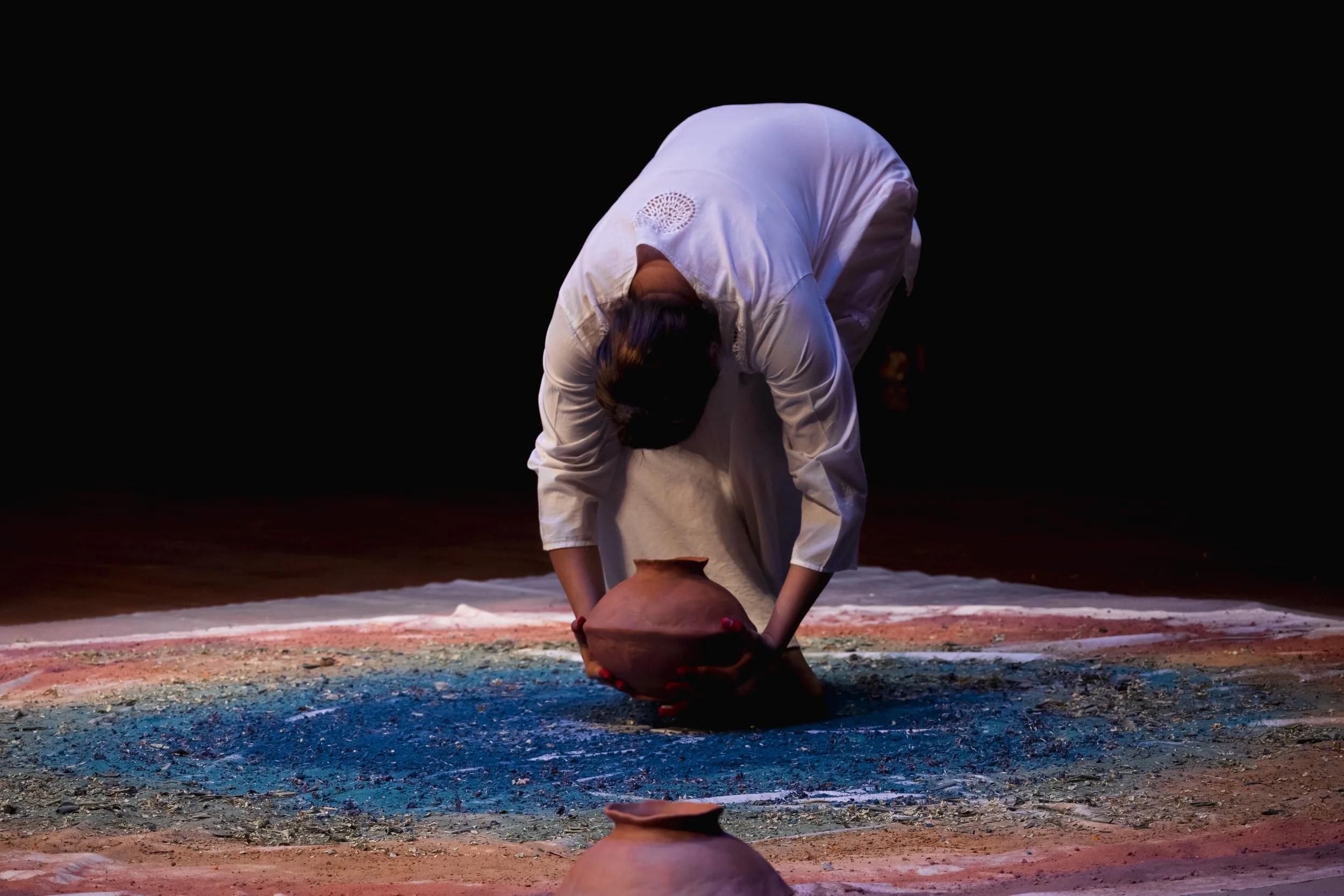 In ‘Restoration Act I’, I reflect on the connection to land and the intangible nature of existence through an embodied release of sand mixed with acrylic, turmeric, dried leaves, and flowers from handmade pots guided by my interpretation of ‘OM’.