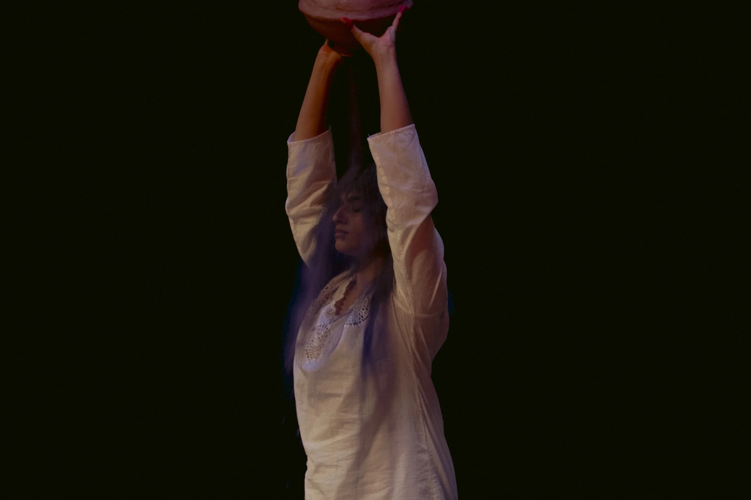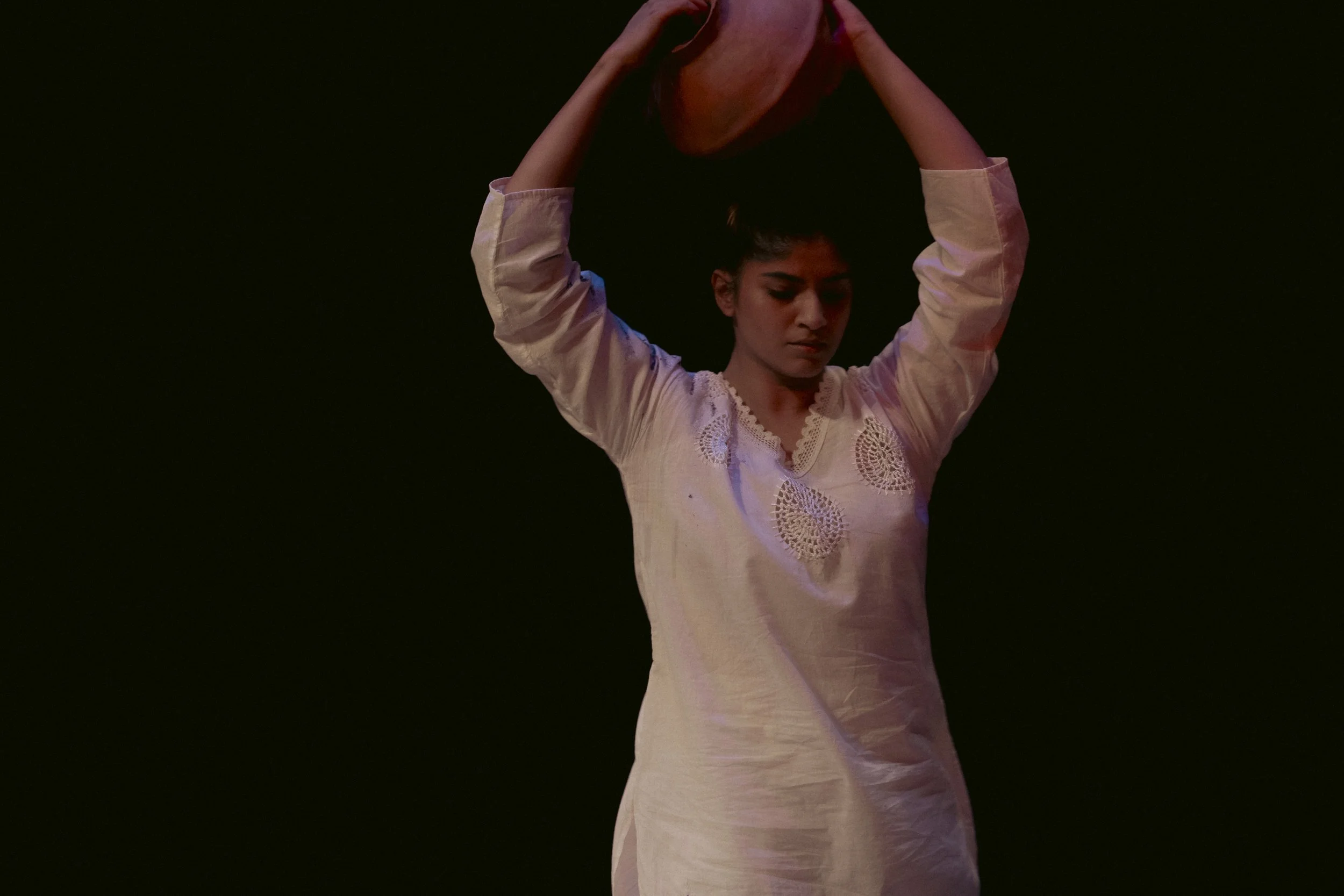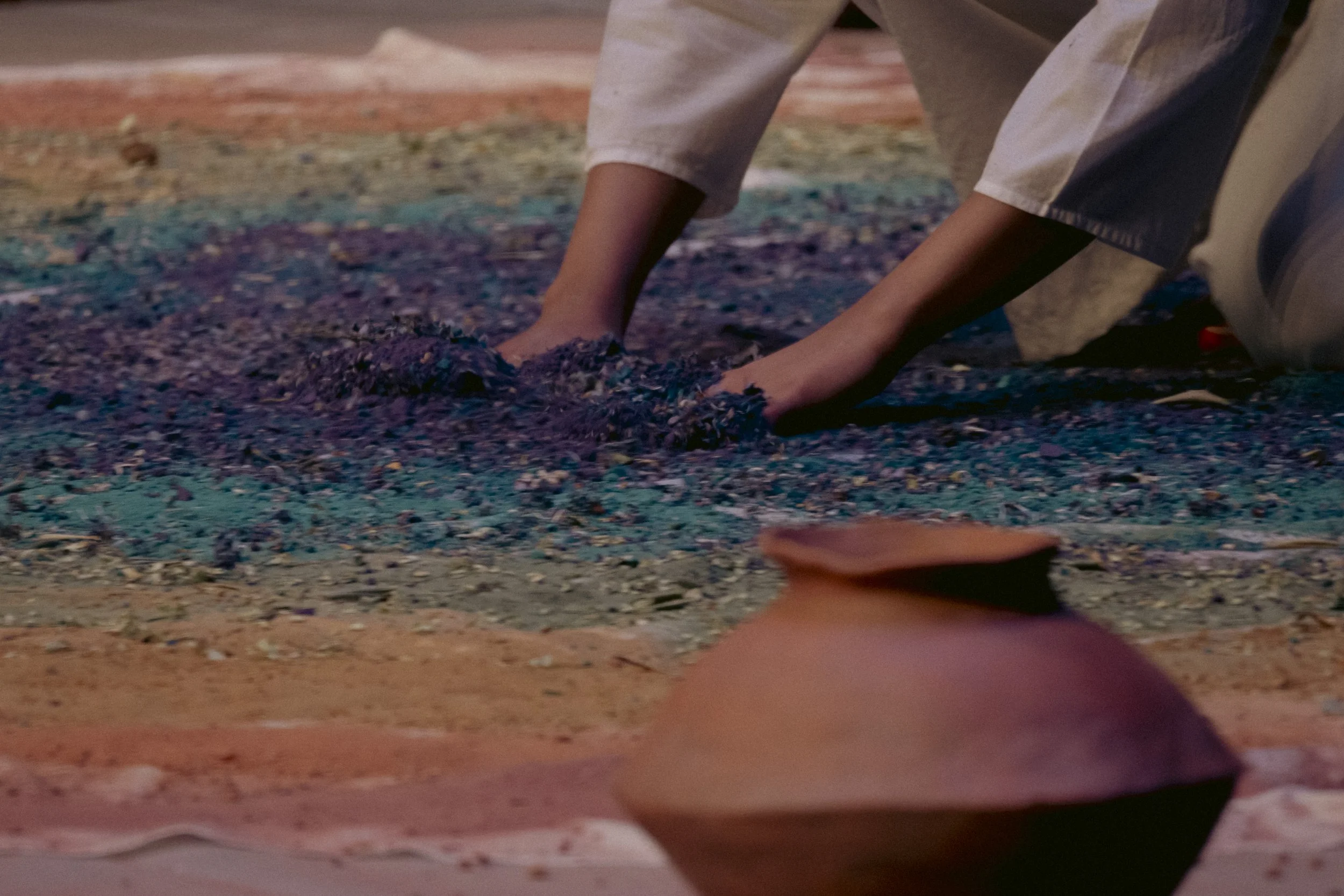 In ‘Restoration Act I’, I reflect on the connection to land and the intangible nature of existence through an embodied release of sand mixed with acrylic, turmeric, dried leaves, and flowers from handmade pots guided by my interpretation of ‘OM’.