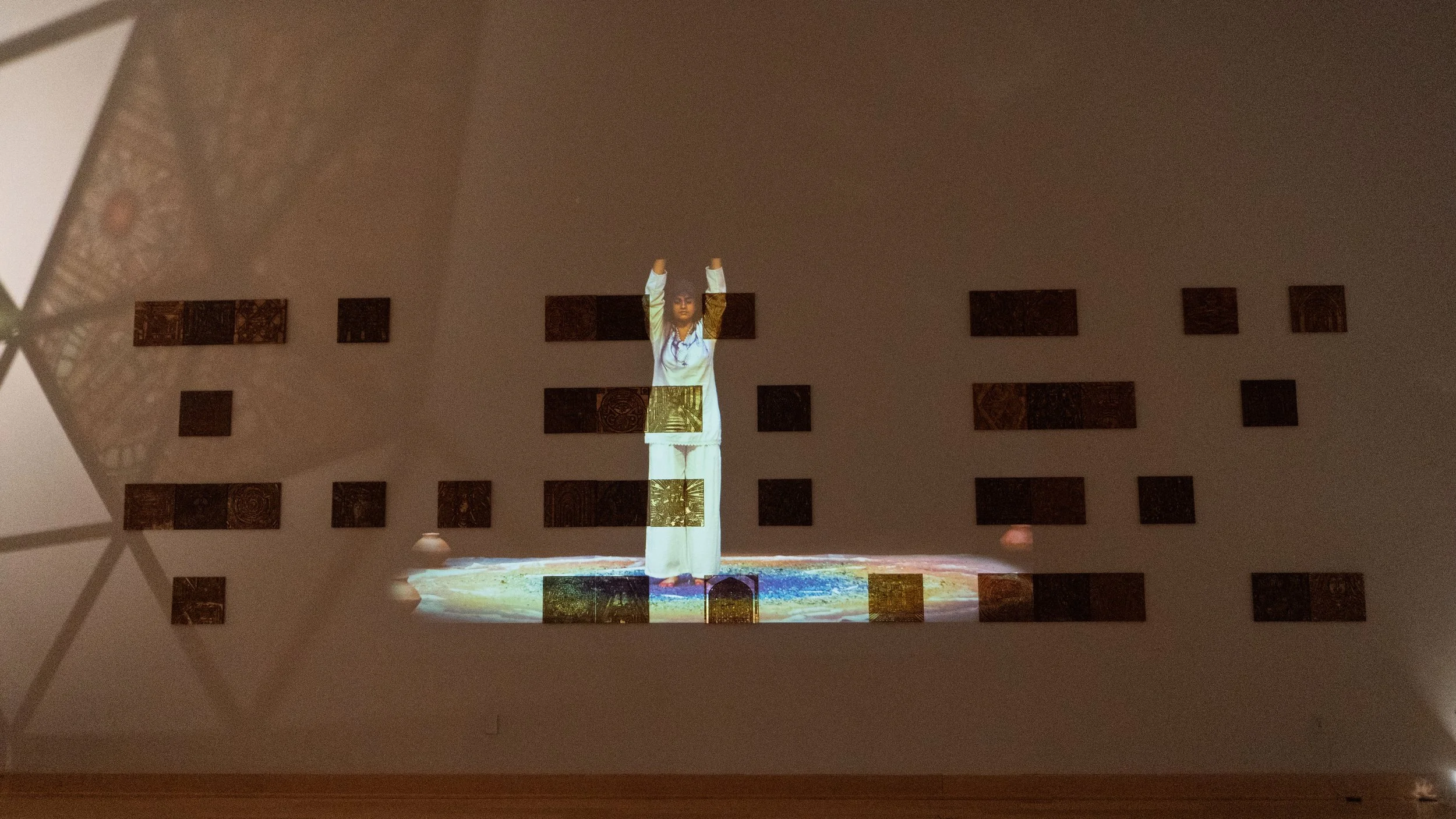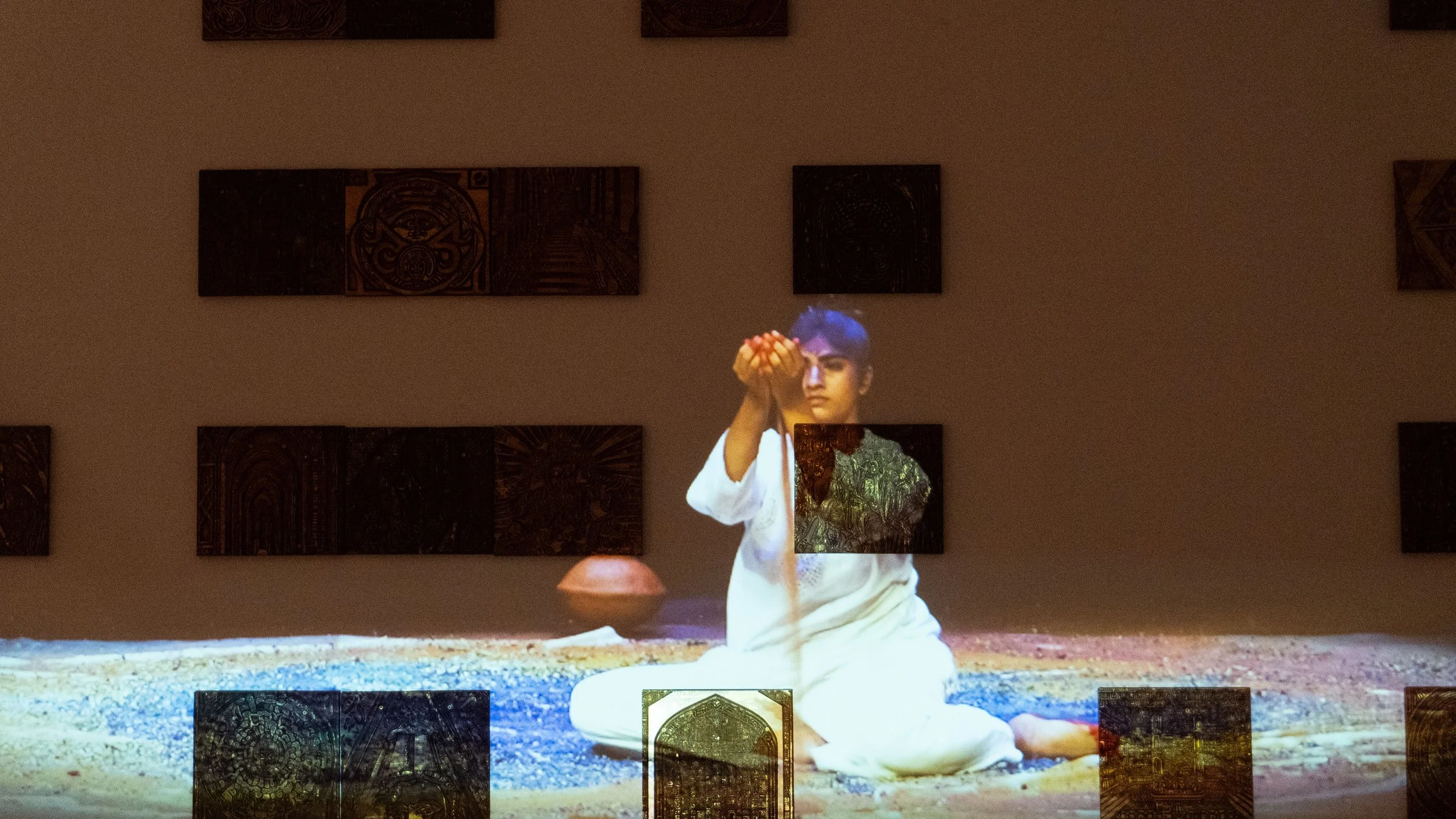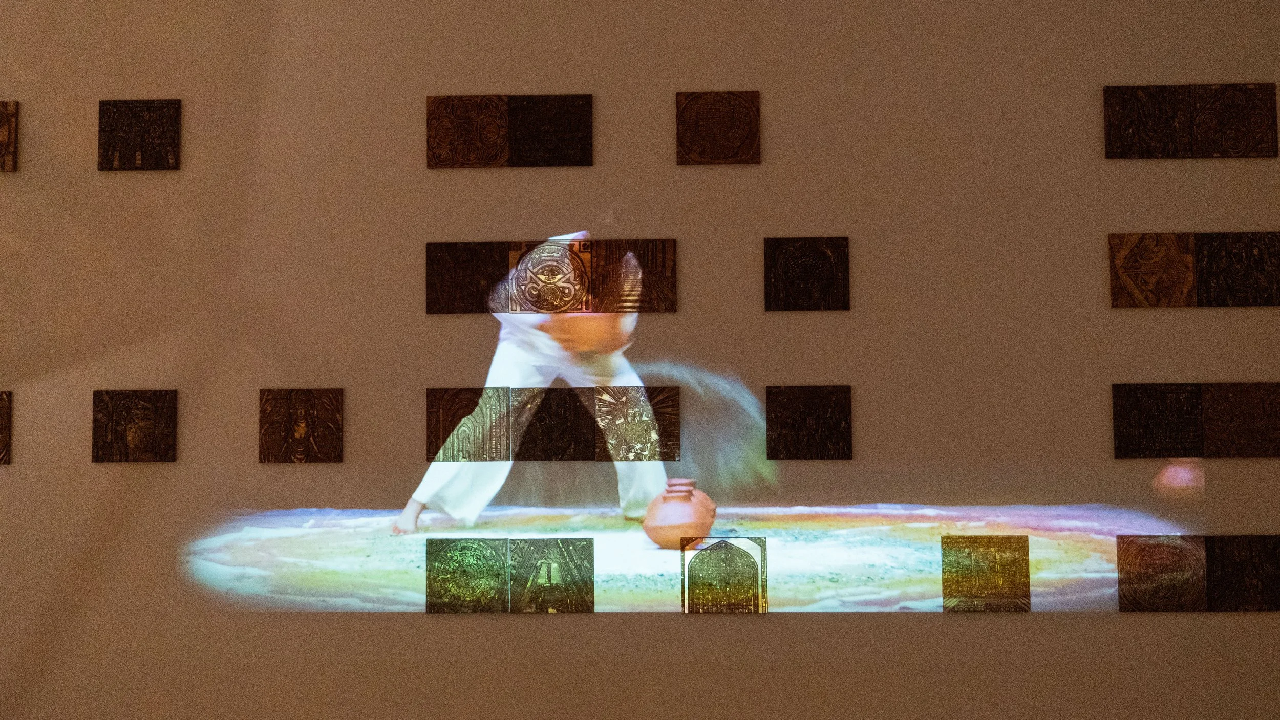 The binary installation with wooden engravings engages with the ephemeral projection of the body from the work ‘Restoration Act I.’ The code spells out ‘The truth is’ while the body searches for it. The wooden blocks represent 1s, and the empty spaces 0s. In this work, I draw an analogy between the transfer of information through binary codes in the past and AI algorithms in the present, questioning what is lost in translation. The projection of my performance remains ephemeral, while the AI images carved into wood have a tangible presence in space. The projection light illuminates each block as I move through the virtual space, transforming the physical surface of the gold-painted engravings. Each moment in the work remains anew as the light creates multiple points of illumination, translating through intricate carvings. Through this interplay of light, objects and body, the work explores the multiplicity of the present moment.