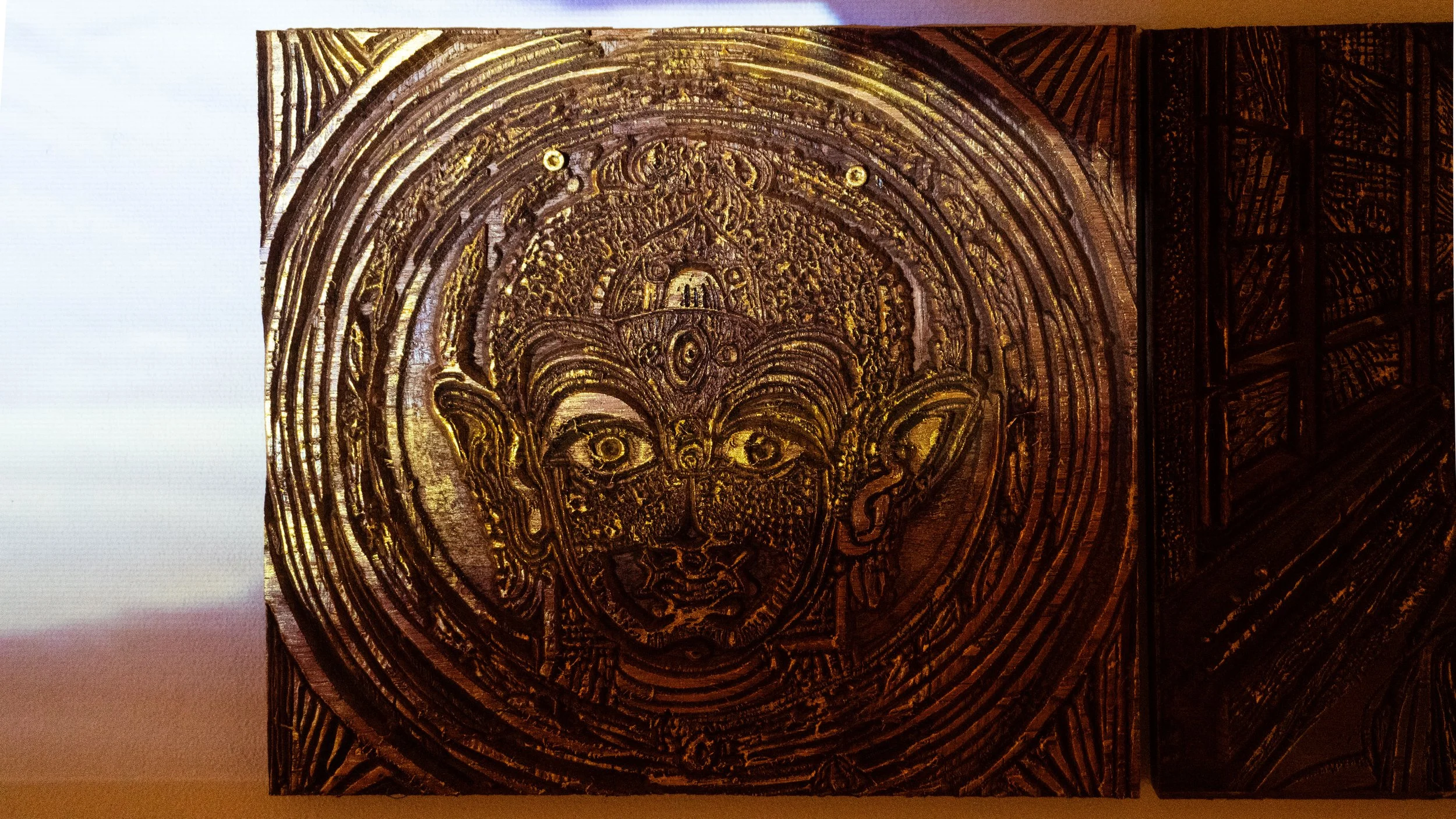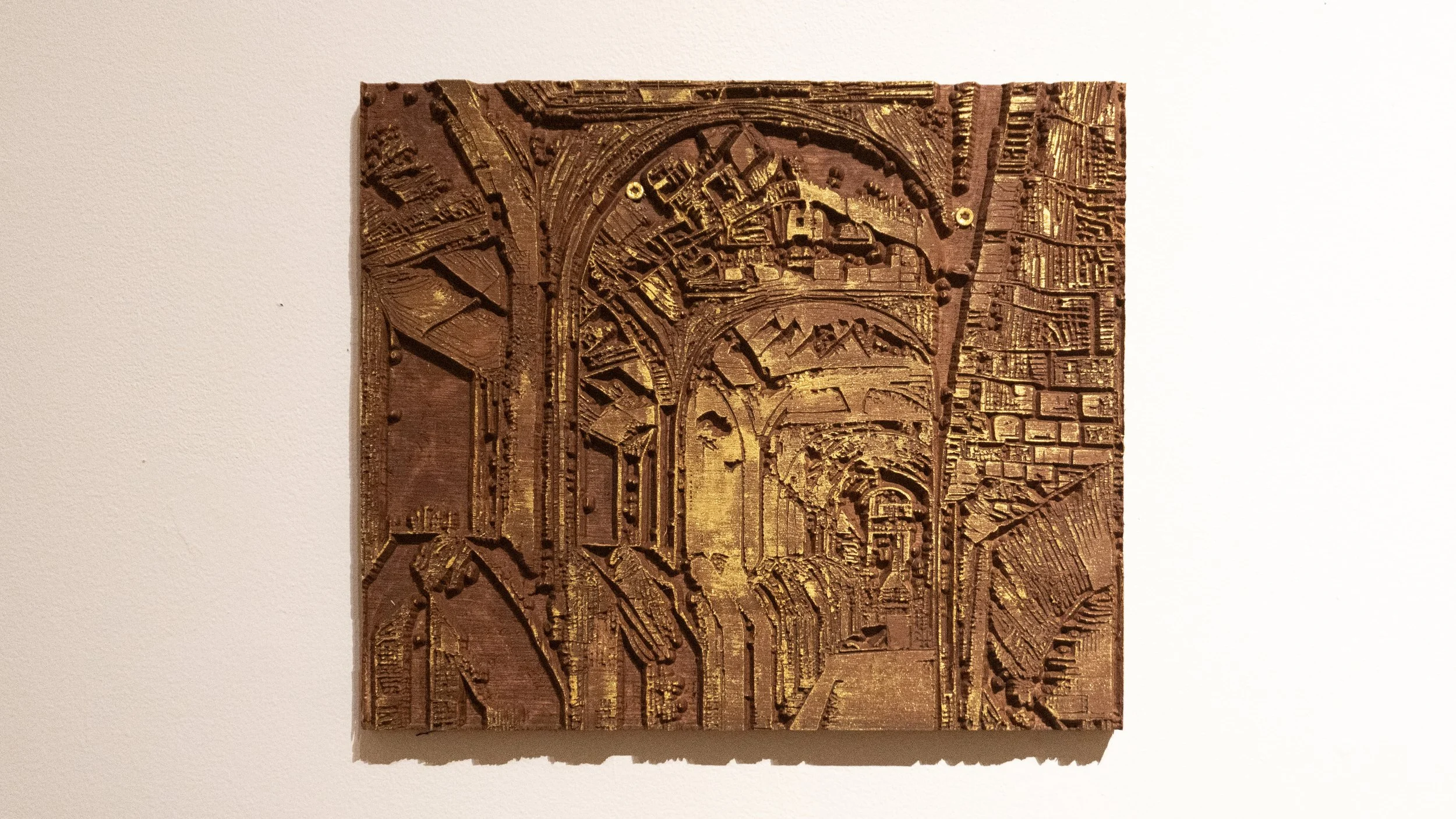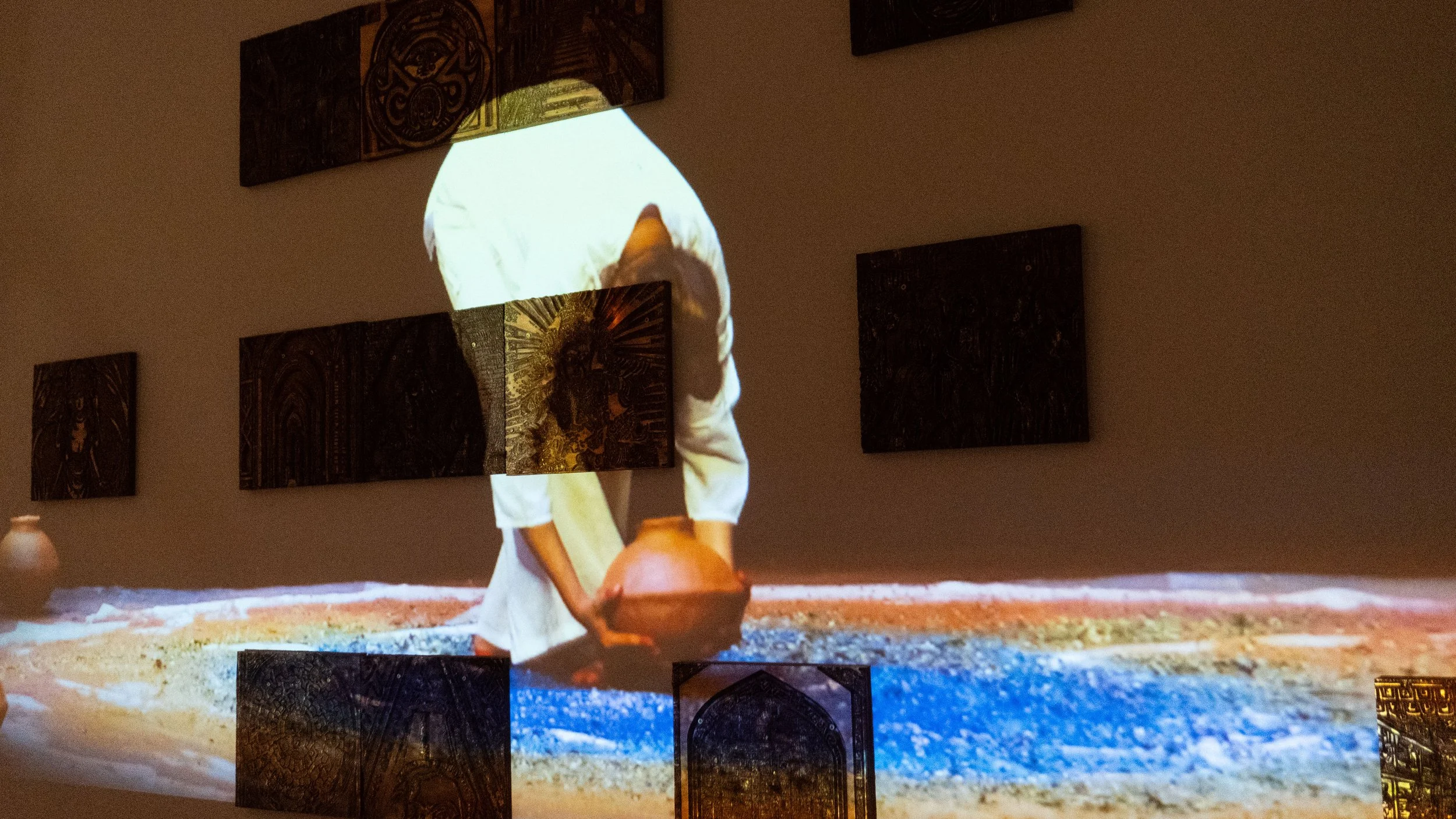 The binary installation with wooden engravings engages with the ephemeral projection of the body from the work ‘Restoration Act I.’ The code spells out ‘The truth is’ while the body searches for it. The wooden blocks represent 1s, and the empty spaces 0s. In this work, I draw an analogy between the transfer of information through binary codes in the past and AI algorithms in the present, questioning what is lost in translation. The projection of my performance remains ephemeral, while the AI images carved into wood have a tangible presence in space. The projection light illuminates each block as I move through the virtual space, transforming the physical surface of the gold-painted engravings. Each moment in the work remains anew as the light creates multiple points of illumination, translating through intricate carvings. Through this interplay of light, objects and body, the work explores the multiplicity of the present moment.